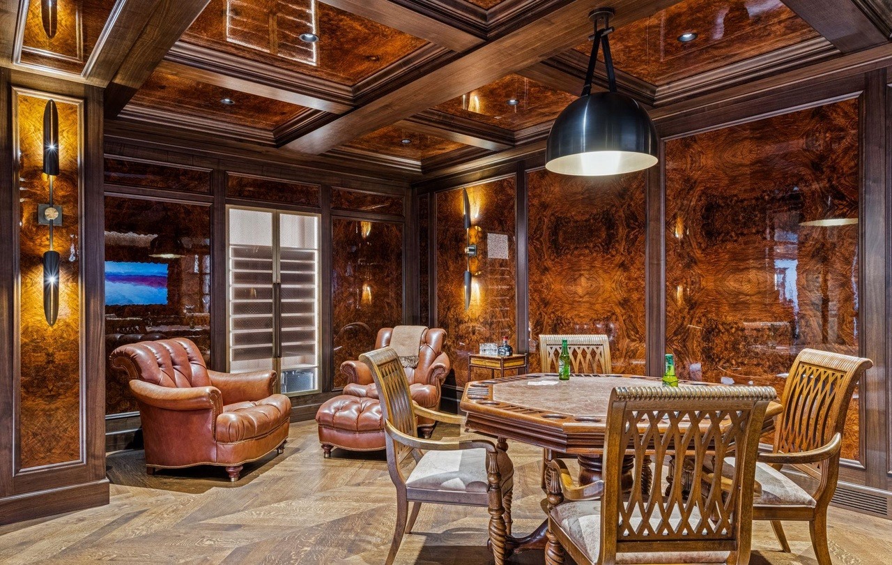 An opulent game room or billiards lounge featuring dramatic burl wood paneling throughout, a coffered ceiling with integrated lighting, and luxurious cognac leather club chairs paired with carved walnut furniture. The space exudes old-world elegance with contemporary refinement, enhanced by warm brass sconces, a sculptural black pendant light, and floor-to-ceiling windows showcasing the craftsmanship and meticulous attention to detail characteristic of ultra-luxury design.