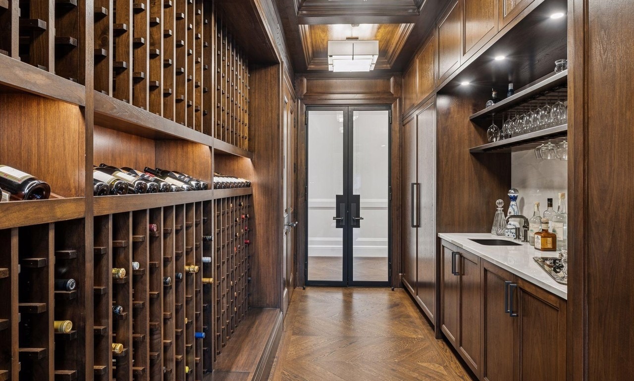 A bespoke wine cellar featuring extensive custom dark walnut racking with wine bottle storage on the left wall and display shelving with stemware storage on the right, creating a gallery-like presentation of an impressive collection. The space is defined by rich wood paneling, professional recessed and statement lighting, a sleek quartz service counter with built-in sink, and refined black hardware, all accented by a coffered ceiling and skylight that elevates the room to museum-quality sophistication.