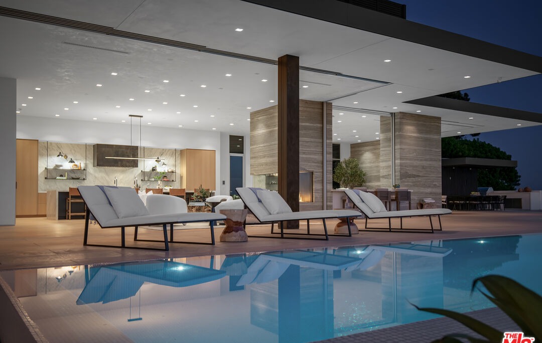 PoolLounge SeatingCovered PatioOutdoor Kitchen VisibleFloor To Ceiling WindowsRecessed LightingStatement LightingModern PergolaWater Feature