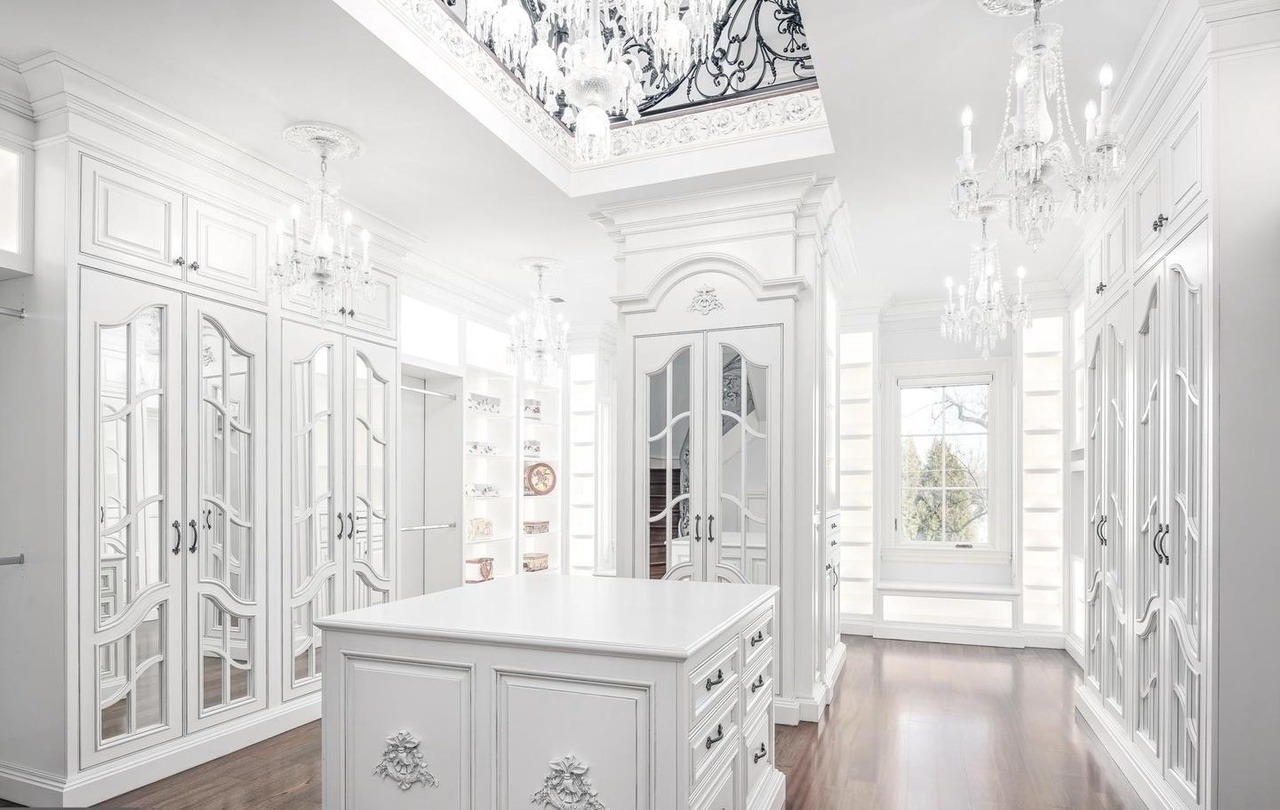 An extraordinary custom walk-in closet featuring pristine white painted cabinetry with mirrored glass fronts, ornamental black hardware, and a stunning marble-topped island. The space is flooded with natural light from a large skylight and illuminated by dual crystal chandeliers, creating a luxurious dressing room that rivals high-end retail environments with its meticulous attention to detail and sophisticated traditional architecture.
