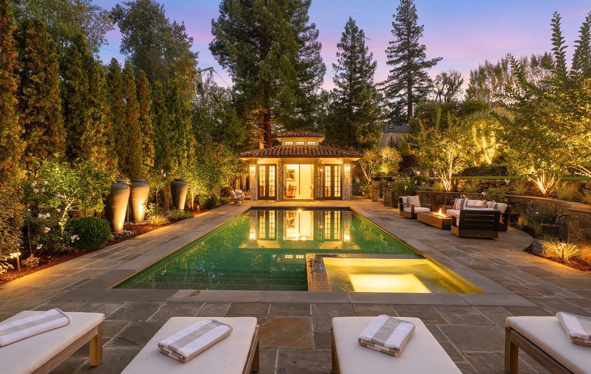 A stunning contemporary desert-modern pool sanctuary featuring a rectangular infinity pool flanked by mature cypress trees, sophisticated landscape lighting, and a minimalist stone poolhouse with floor-to-ceiling glass doors. The design seamlessly blends warm earth tones, natural materials, and precision lighting to create an editorial-quality outdoor living space that epitomizes high-end luxury resort aesthetics.