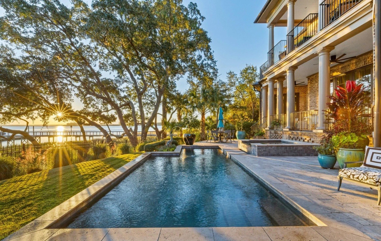 An extraordinary waterfront pool and spa retreat featuring a lap pool with integrated hot tub, anchored by a sophisticated brick colonial-style residence with columned portico. The space seamlessly blends refined coastal elegance with organic modern design, accented by curated turquoise ceramics and mature specimen trees, bathed in golden-hour light and offering panoramic water views.