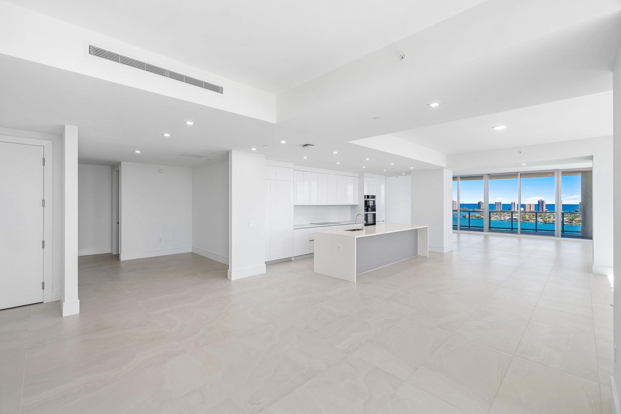 A stunning contemporary kitchen featuring minimalist white cabinetry with a waterfall-edge quartz island, polished concrete flooring, and floor-to-ceiling windows framing expansive ocean and coastal city views. The space exemplifies luxury modern design with clean lines, integrated appliances, recessed lighting, and seamless indoor-outdoor flow typical of high-end Southern California residential architecture.