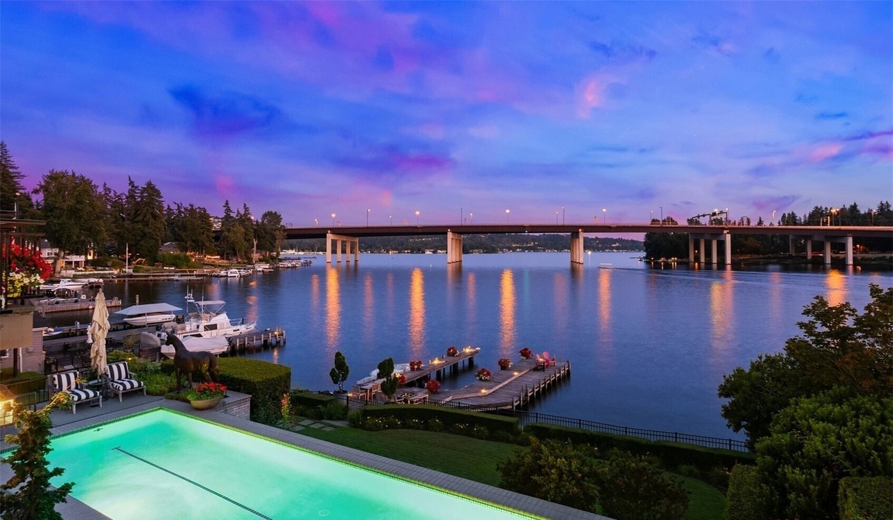 A breathtaking waterfront pool and entertainment area featuring a luminous turquoise lap pool with modern white loungers, manicured lawn, and direct water access with docked boats. Twilight lighting casts golden reflections across the serene bay as a contemporary bridge spans the water in the distance, creating a sophisticated outdoor sanctuary that seamlessly blends luxury coastal living with organic modern design.