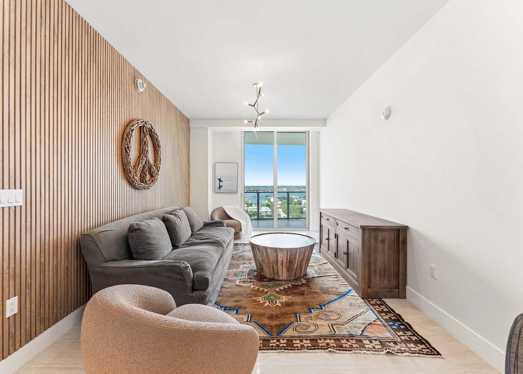 Floor To Ceiling WindowsPanoramic Water ViewsStatement FurnitureNatural TexturesWoven Wreath AccentHigh CeilingsContemporary Rug