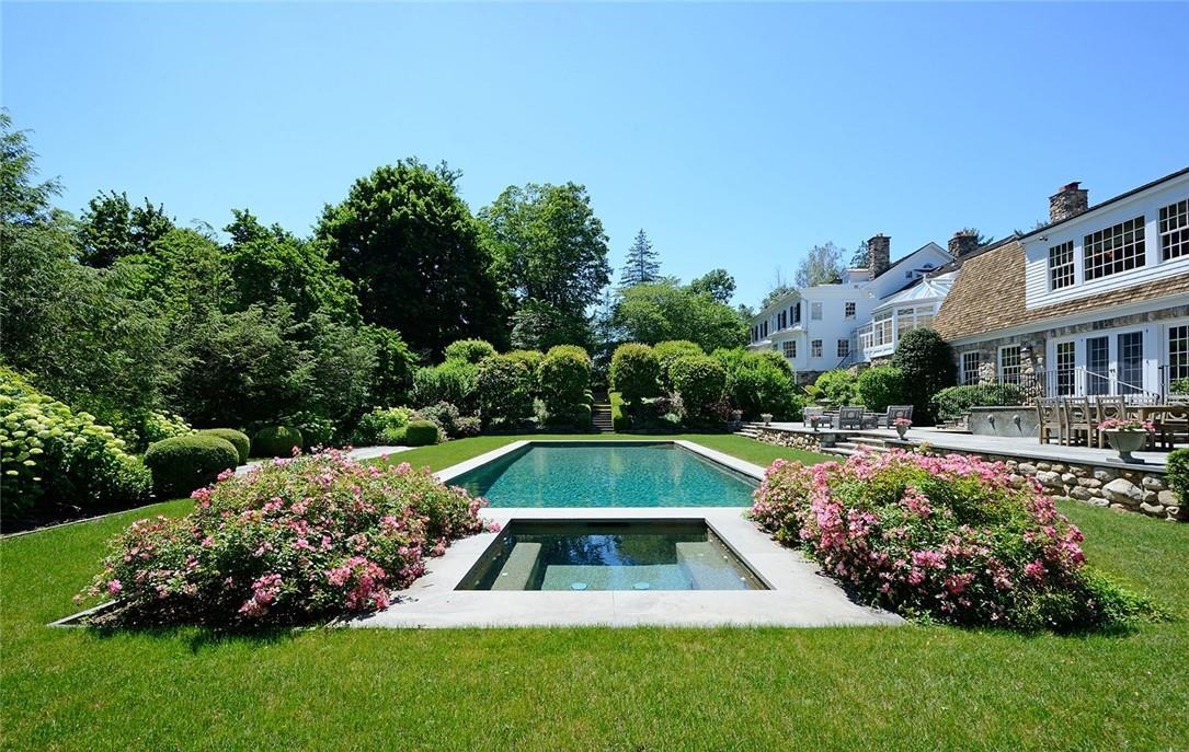 A pristinely designed luxury pool area featuring a rectangular lap pool flanked by vibrant pink flowering hedges, with a sunken hot tub, professional lounge seating, and a sophisticated white colonial-style house with pergola-covered outdoor entertaining space. The manicured landscaping, perfectly composed geometry, and editorial-quality photography exemplify high-end New England estate design.