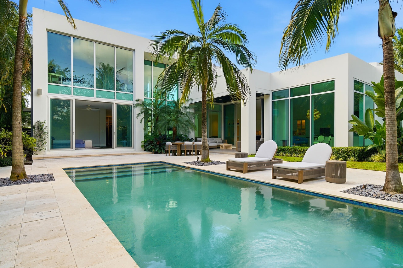 A stunning modern resort-style pool courtyard featuring a rectangular turquoise swimming pool framed by pristine stone pavers, flanked by minimalist white architectural volumes with floor-to-ceiling windows and integrated landscaping. The space exemplifies luxury contemporary design with its seamless indoor-outdoor flow, natural palm tree landscaping, and sophisticated lounge furniture arranged on the sunny terrace.