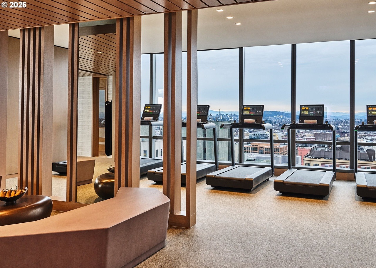 A stunning high-rise luxury gym featuring floor-to-ceiling windows showcasing panoramic city and mountain views, with a warm wood-slat ceiling and natural wood partition walls creating an elegant, open layout. The space seamlessly blends organic modern warmth with contemporary minimalism, featuring multiple treadmills with integrated technology and sophisticated lighting that emphasizes the dramatic architectural details.