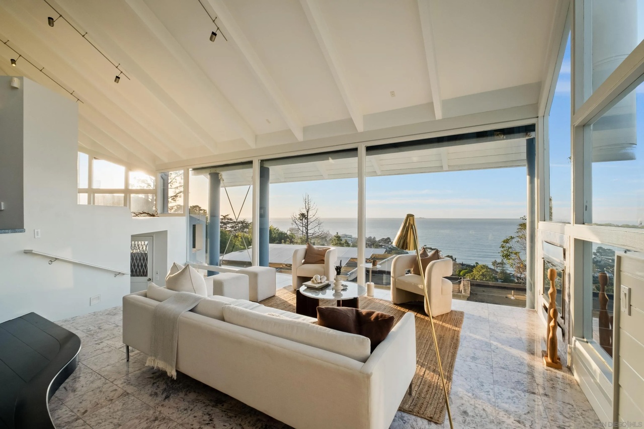 A stunning modern coastal living room defined by floor-to-ceiling ocean views and refined minimalist elegance. The space showcases a sophisticated palette of cream, beige, and white furnishings anchored by polished marble flooring, with a coffered ceiling and strategically placed accent pieces in bronze and warm wood that create warmth without compromising the serene, airy aesthetic.