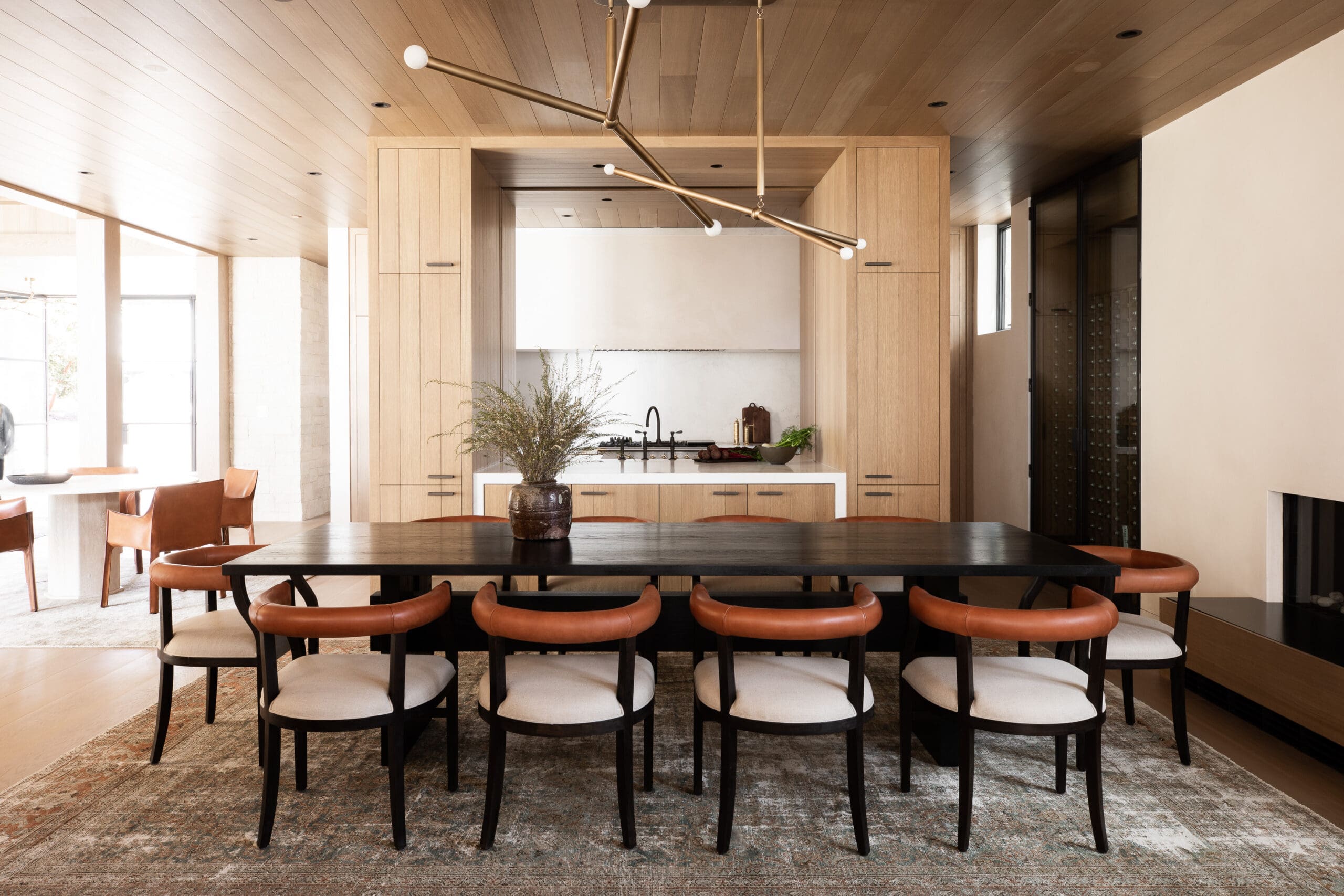A stunning open-concept dining room featuring a dramatic black dining table surrounded by sculptural chairs with cognac leather curved backs and cream upholstery, anchored by an architectural brass mobile chandelier. The space seamlessly flows into a light wood kitchen with floor-to-ceiling cabinetry and wood plank ceilings, creating a warm, sophisticated aesthetic with abundant natural light from expansive windows.