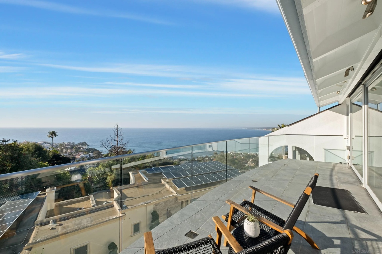 A sophisticated coastal modern patio overlooking the Pacific Ocean, featuring clean-lined white architectural elements, polished concrete flooring, frameless glass railings, and minimalist wooden lounge seating with coastal sophistication. The space seamlessly integrates indoor-outdoor living with sustainable solar panels visible on lower levels and panoramic ocean vistas that define this ultra-luxury Southern California residence.