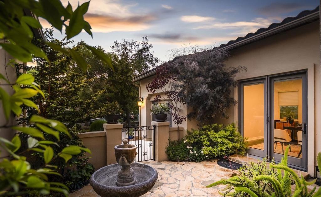 An elegantly appointed Mediterranean-inspired patio features warm cream stucco walls draped with cascading ivy, rustic stone pavers, and wrought iron railings that frame a sophisticated outdoor living space. The design seamlessly blends indoor-outdoor living with generous glass doors opening onto a fountain-anchored courtyard, creating a serene yet luxurious retreat bathed in golden evening light.