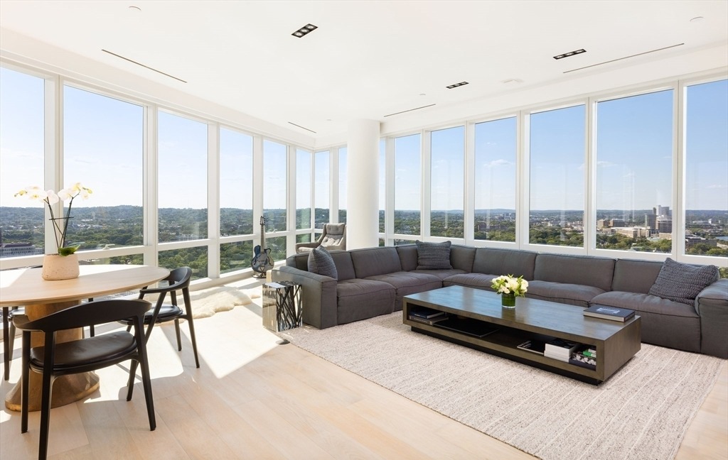 A breathtaking high-rise living room featuring expansive floor-to-ceiling windows showcasing sweeping cityscape and landscape vistas. The space combines organic modern design with clean-lined furniture, warm light wood flooring, and a sophisticated neutral palette accented by contemporary upholstered seating and understated accessories that prioritize the dramatic natural views.