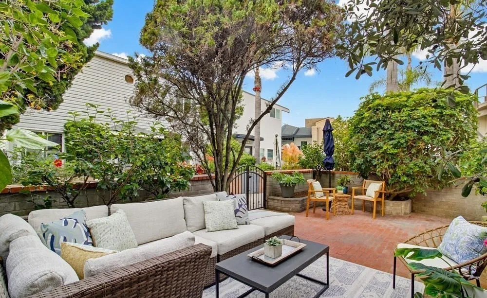 A sophisticated outdoor patio featuring warm terracotta brick flooring, lush mature landscaping, and curated woven rattan seating with neutral linens and blue accents. The space balances relaxed coastal elegance with modern organic design through layered natural textures, a black iron gate, and mature shade trees creating an intimate, resort-like retreat.