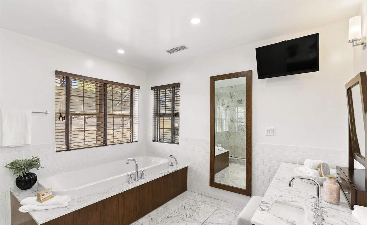 A sophisticated primary bathroom featuring dual marble vanities, a luxurious freestanding soaking tub, and an expansive walk-in shower with frameless glass enclosure. The space balances contemporary finishes with warm dark wood cabinetry and abundant natural light from multiple windows with wood-framed shutters, creating a serene and upscale spa-like retreat.
