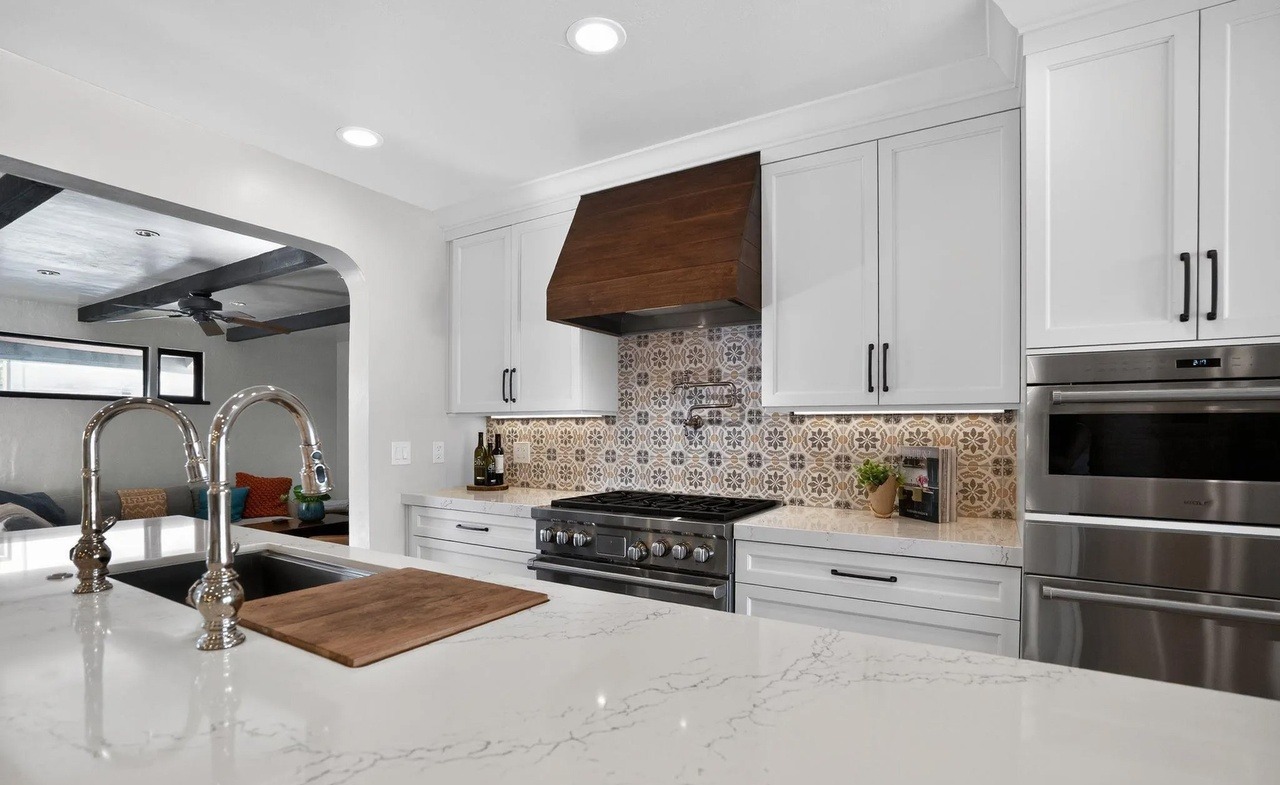 A stunning transitional kitchen featuring a marble waterfall island, crisp white shaker cabinetry, and an ornate patterned ceramic tile backsplash that serves as a striking focal point. The space masterfully blends contemporary clean lines with warm natural materials and traditional crown molding, elevated by professional-grade black appliances and brass accent fixtures.