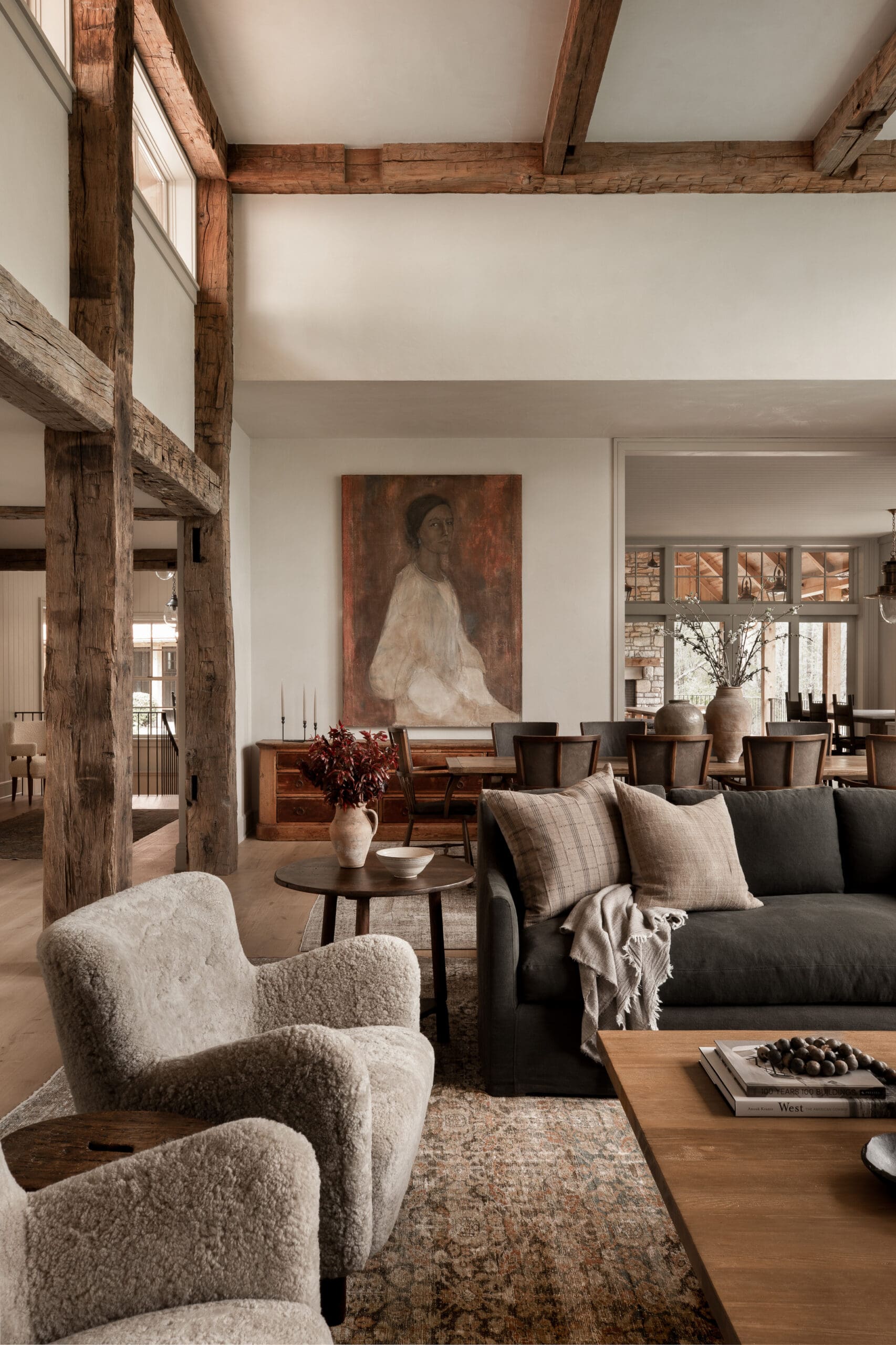 A sophisticated living room featuring dramatic reclaimed wood post-and-beam architecture with soaring ceilings, anchored by sculptural shearling chairs and an olive-toned leather sofa. The space masterfully blends organic modern design with rustic elements, showcasing vintage artwork, natural materials, and an expertly curated palette of warm neutrals and earth tones.