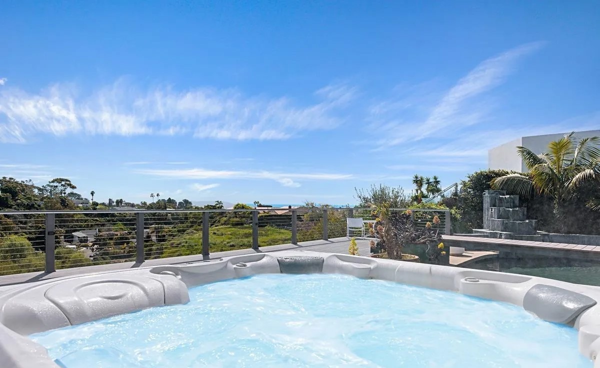 A stunning contemporary pool and spa area featuring a pristine light-blue spa with integrated lounge seating, panoramic metal cable railings, and sweeping views of manicured grounds and distant landscape. The minimalist concrete deck and sophisticated outdoor furnishings exemplify high-end Southern California modern design with seamless indoor-outdoor living integration.