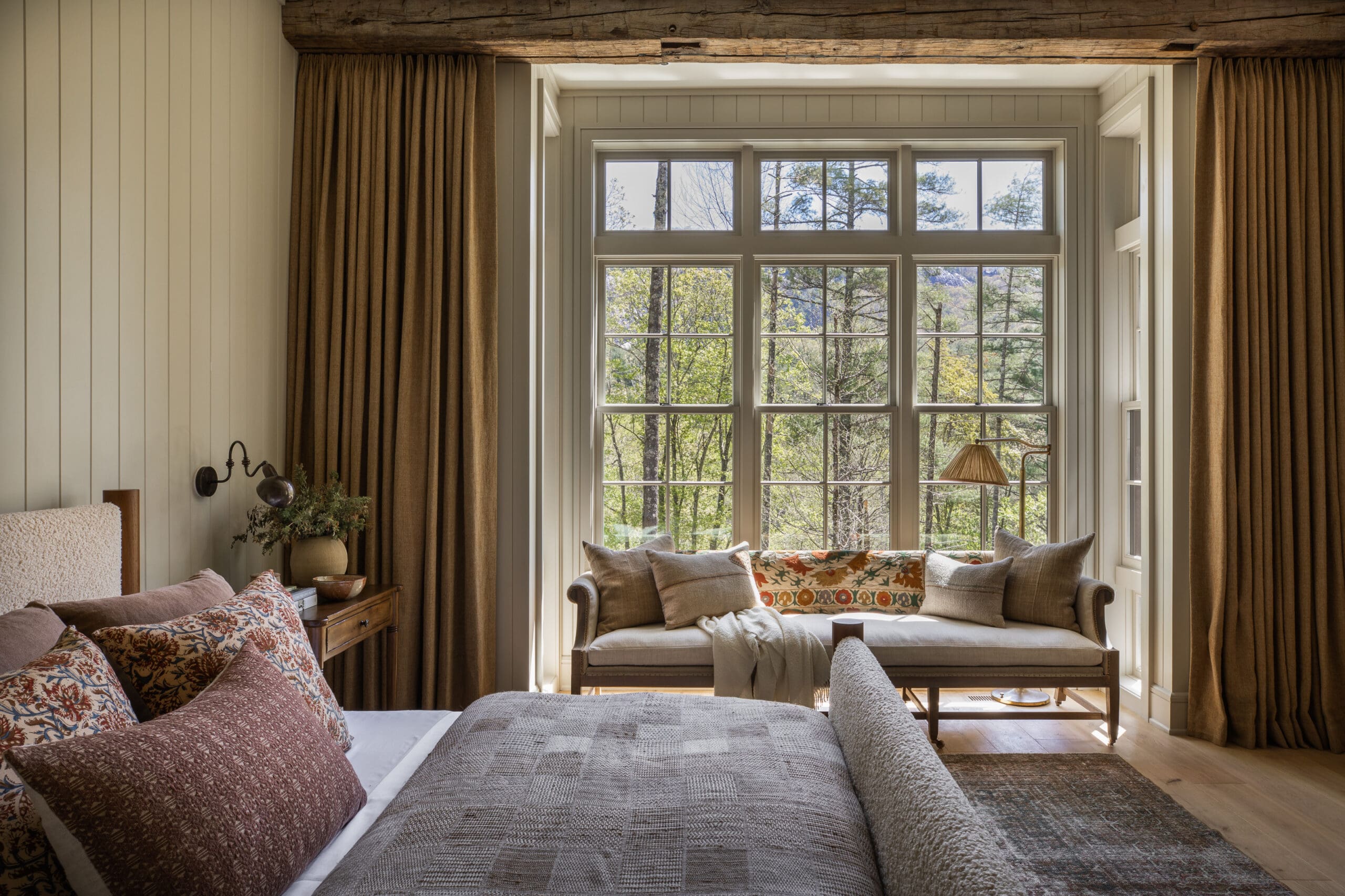 A sophisticated primary bedroom featuring expansive multi-pane windows with a built-in window seat overlooking mountain views, anchored by reclaimed wood ceiling beams and warm neutral textiles. The space masterfully blends organic modern sensibility with transitional architectural details, creating a serene retreat with abundant natural light and refined material choices.