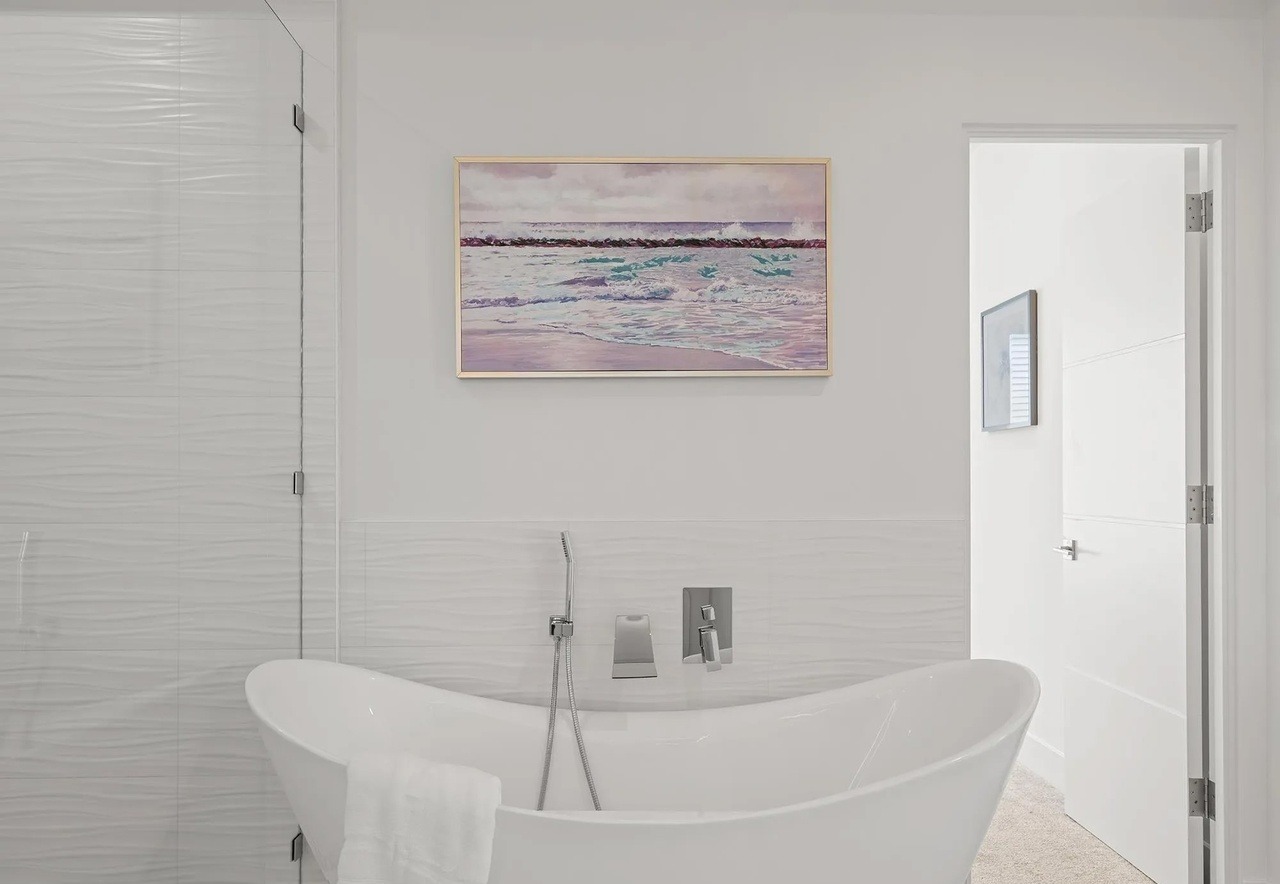 A serene primary bathroom featuring a sculptural freestanding soaking tub paired with a seamless frameless glass walk-in shower, unified by soft white large-format tile throughout. The space is elevated by a calming coastal-inspired artwork and minimalist chrome fixtures that create an airy, spa-like sanctuary.