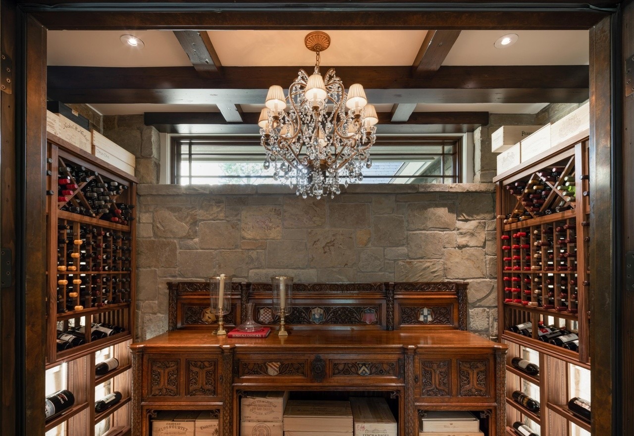 Wine Storage RacksCarved Wooden CabinetryCentral Counter DisplayOrnate Wood DetailingStone Accent WallCoffered Ceiling With BeamsChandelier LightingCustom MillworkLarge Format WindowsCandelabra Centerpiece