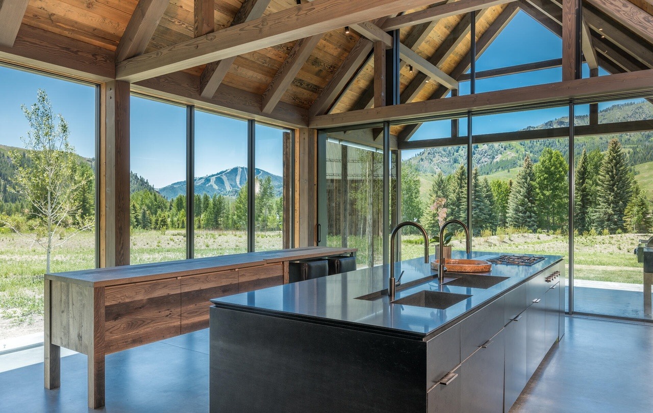 IslandWaterfall IslandFloor To Ceiling WindowsOpen ConceptExposed BeamsVaulted CeilingHigh CeilingsPot FillerStatement Lighting
