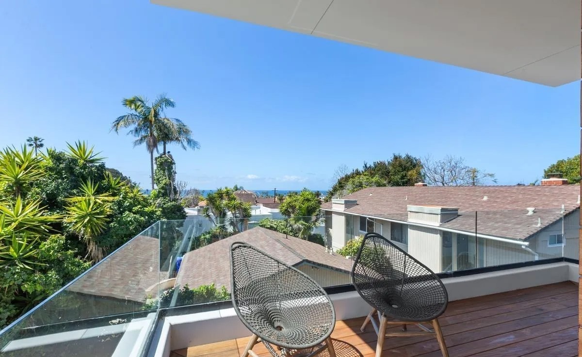 A sophisticated coastal-modern patio with sweeping ocean views, featuring minimalist black mesh lounge chairs positioned for optimal sightlines and a composite deck with glass railings that maintain sight lines to the landscape. The space exemplifies California modern design with its seamless indoor-outdoor flow, tropical plantings, and neutral material palette accented by warm wood tones.
