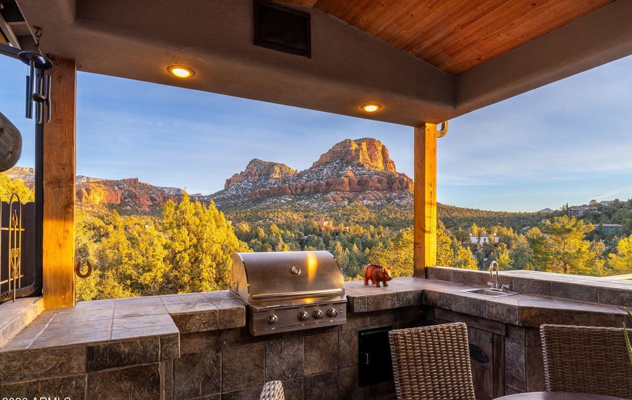 A breathtaking outdoor kitchen featuring premium built-in appliances and expansive stone countertops, anchored by a dramatic red-rock mountain vista and lush desert forest landscape. The warm wood-plank ceiling, recessed lighting, and sophisticated material palette create a high-end entertaining space that seamlessly integrates luxury design with the natural Arizona landscape.
