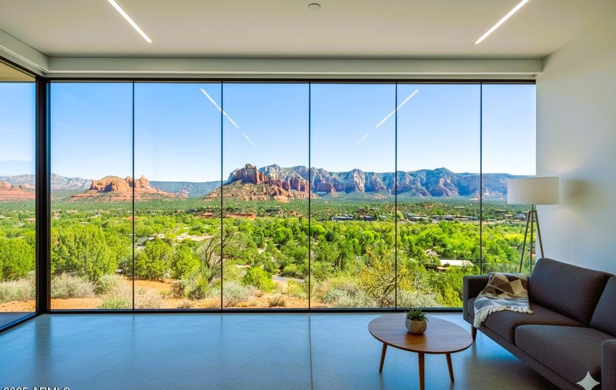 A breathtakingly designed desert modern living room showcasing Sedona's red rock formations through expansive floor-to-ceiling glass walls, with minimalist furnishings anchored by a polished concrete floor and warmed by a sculptural wooden side table. The space epitomizes modern luxury through its seamless indoor-outdoor integration and editorial-quality composition.