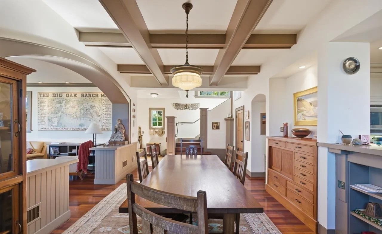 This sophisticated dining room exemplifies transitional design with its coffered ceiling, exposed timber beams, and refined furnishings anchoring an open-concept living space. The warm wood and cream palette, combined with custom millwork and brass accents, creates an elegant yet inviting atmosphere with clear ranch heritage elements.