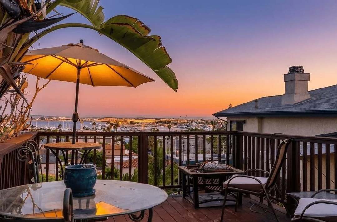 This elevated deck patio overlooking a sprawling coastal bay epitomizes Southern California luxury living with seamless indoor-outdoor design. Golden-hour sunset lighting illuminates the warm wood deck, contemporary furnishings, and yellow umbrella, while the stunning panoramic water views and manicured landscape below create an aspirational resort-like atmosphere.