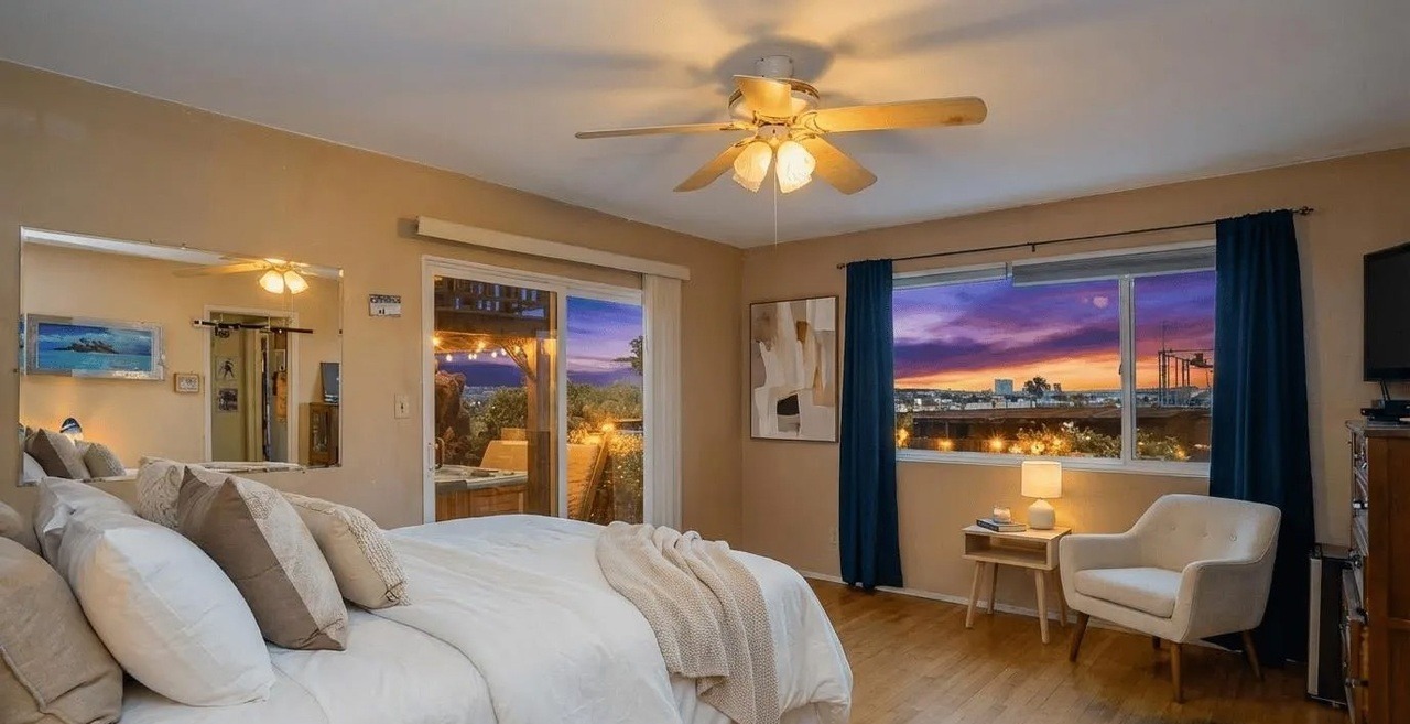 An expansive primary bedroom suite featuring floor-to-ceiling windows framing a stunning sunset cityscape, with warm neutral tones, a plush white bedding ensemble, and mid-century-inspired furnishings balanced by elegant transitional millwork details. The space exudes luxury and serene sophistication, enhanced by thoughtful brass accent lighting and refined proportions that emphasize both comfort and contemporary design excellence.