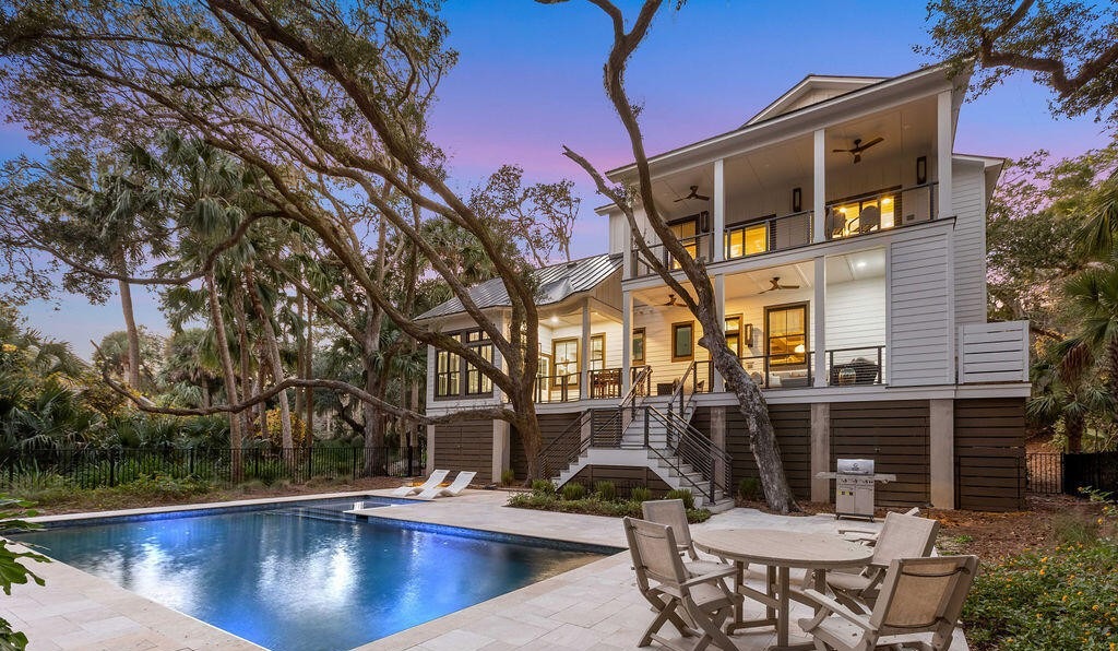 A stunning poolside oasis seamlessly integrating mature native trees with contemporary architecture, featuring an illuminated salt-water pool, elevated multi-level composite decking, and a sophisticated outdoor living space under covered pavillions at twilight. The design exemplifies organic modern luxury with its clean white and charcoal palette, thoughtful landscape preservation, and seamless indoor-outdoor flow.