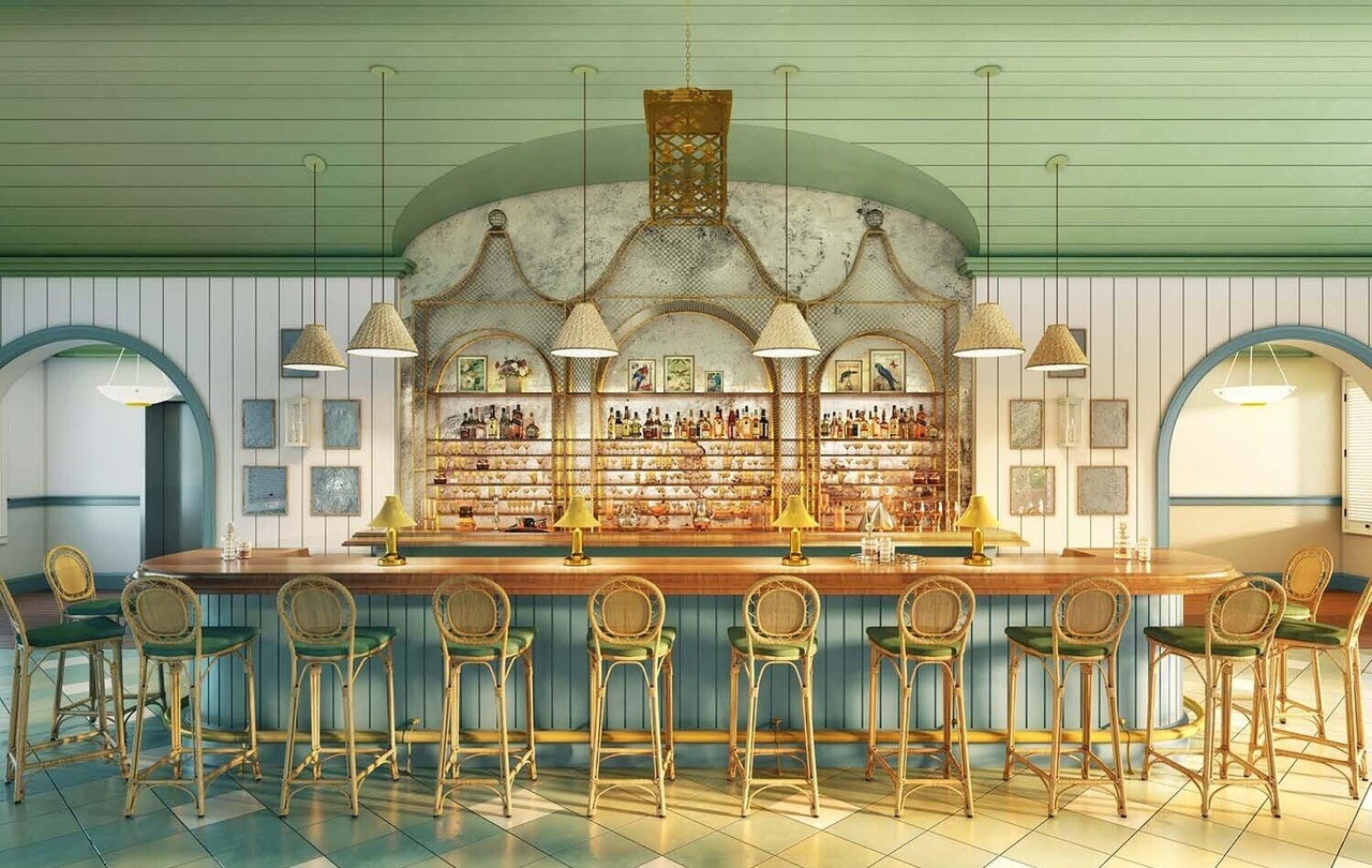 A stunning Art Deco bar featuring a grand domed ceiling with ornate brass detailing, sage green wainscoting, and an elaborate arched back bar with mirrored shelving displaying an extensive liquor collection. The space is elevated by museum-quality finishes, custom brass pendant lighting, classic rattan bar seating, and geometric tile flooring that exudes Old World glamour and timeless elegance.