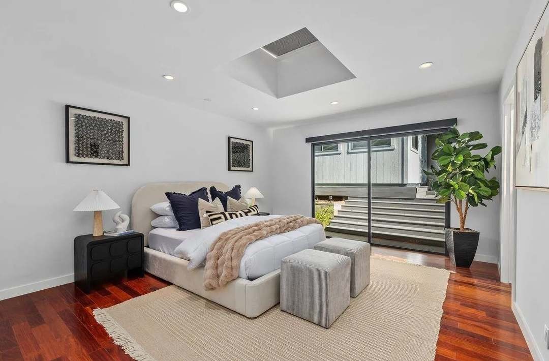 A sophisticated primary bedroom suite flooded with natural light from a large skylight and floor-to-ceiling sliding glass doors, featuring clean-lined contemporary furnishings in neutral tones anchored by warm hardwood floors and accented with navy and tan textiles. The design balances serene minimalism with subtle luxury details including crown molding, a sculptural rounded bed frame, and carefully curated artwork and greenery.