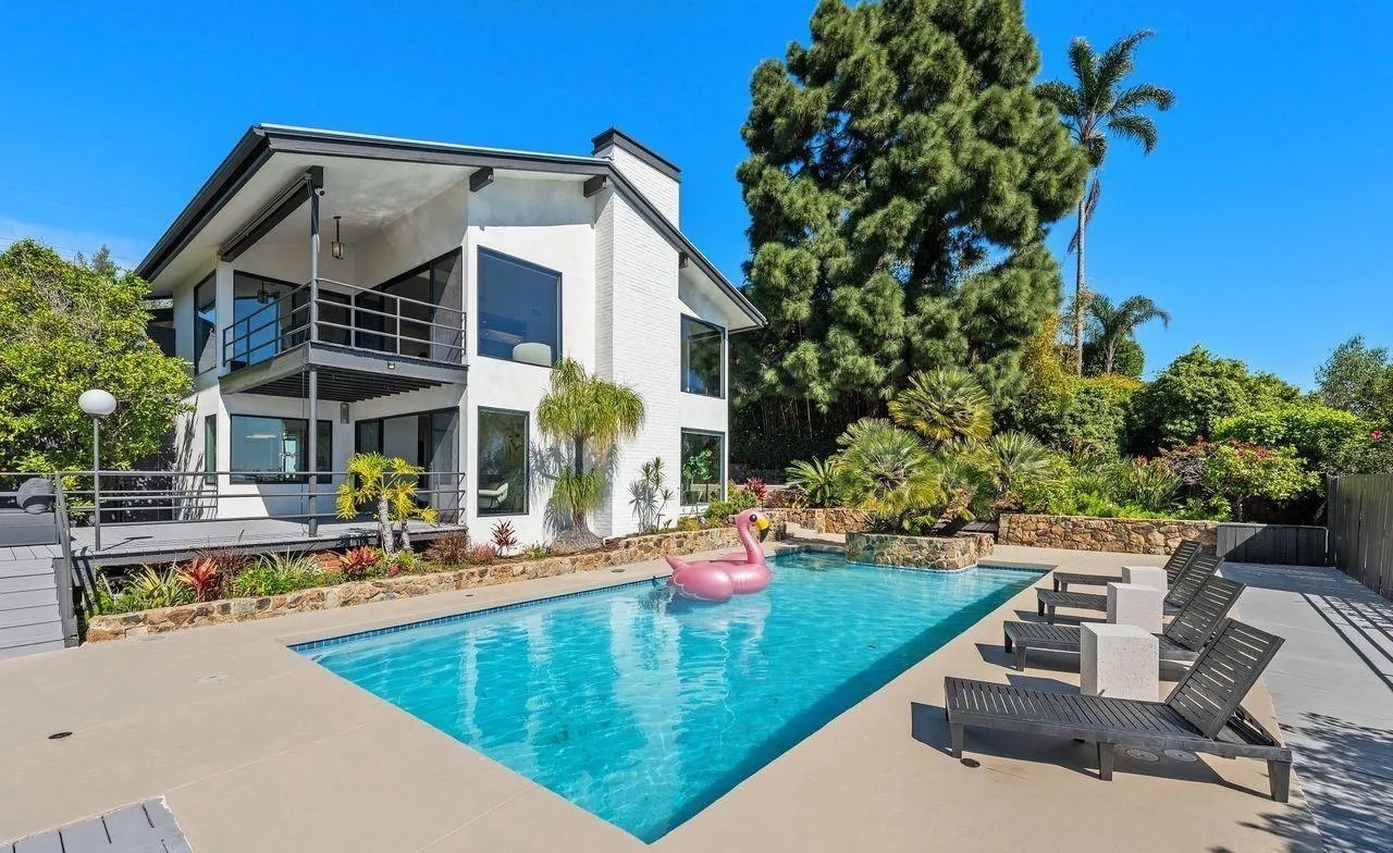 A stunning modern pool oasis featuring a resort-style rectangular pool with crisp turquoise water, surrounded by pristine concrete decking and anchored by a sleek white geometric residence with black metal railings and floor-to-ceiling glass. The landscape is carefully curated with mature palm trees, tropical plantings, and lounge seating, creating an elegant indoor-outdoor living experience with abundant natural light and sophisticated material restraint.