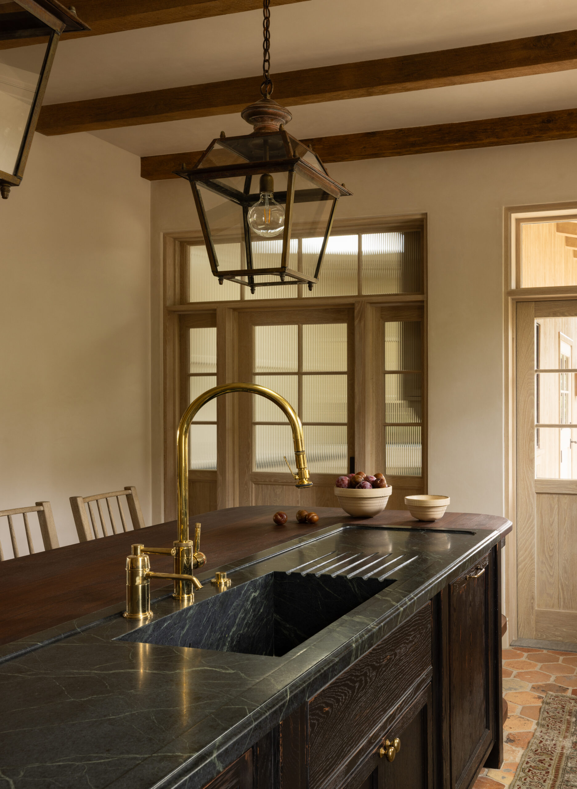 A sophisticated transitional kitchen featuring a striking black marble waterfall island with brass hardware and a sculptural pendant light, anchored by exposed timber beams and cream walls that create warm elegance. The space seamlessly blends classic architectural details with contemporary luxury finishes and abundant natural light from multi-paned windows.