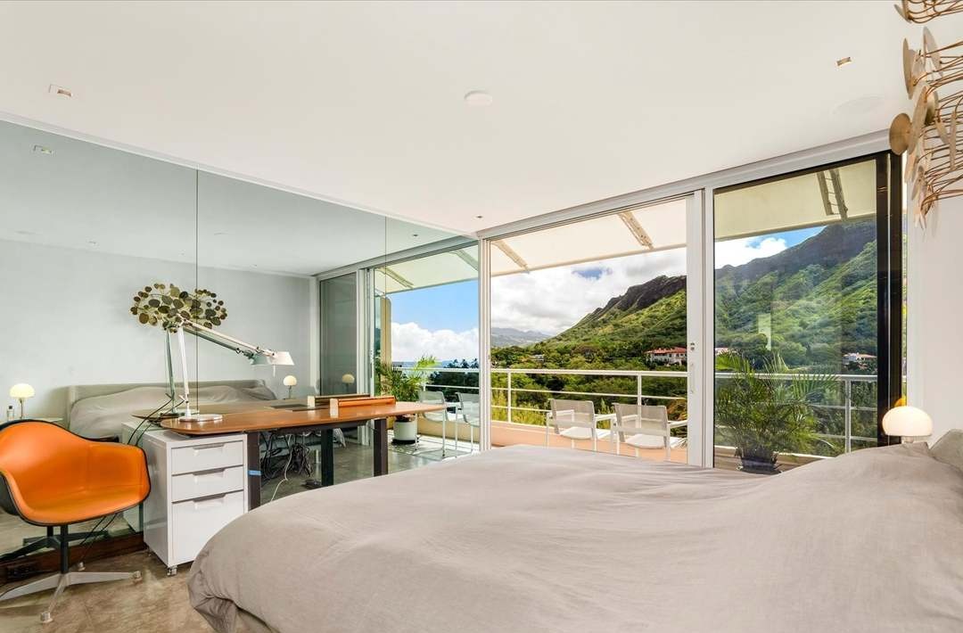 An exceptionally sophisticated primary bedroom suite with expansive floor-to-ceiling glass walls framing dramatic mountain and valley views, seamlessly integrating indoor living with a private balcony. The design balances minimalist white cabinetry and bedding with warm wood furnishings and carefully curated accent pieces, creating a serene yet commanding retreat enhanced by abundant natural light and professional architectural detailing.
