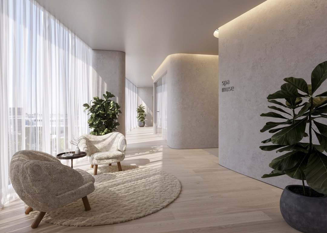 A serene spa-inspired entryway featuring warm minimalist design with sculptural white architecture, soft plaster walls, and abundant natural light filtered through floor-to-ceiling sheer curtains. The space incorporates curated organic elements—linen furnishings, potted plants, and light wood flooring—creating a refined, wellness-focused ambiance that bridges contemporary luxury with calming, zen-like sophistication.