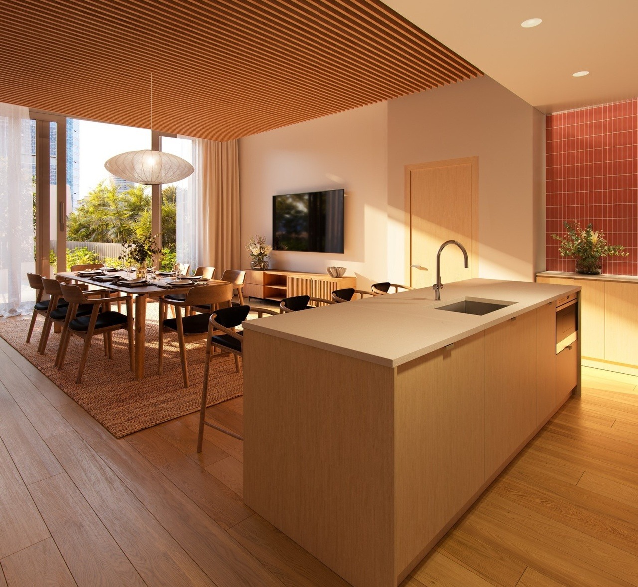 A warm, light-filled open-concept kitchen featuring a sculptural light wood island with waterfall quartz countertop and integrated black hardware, anchoring a seamlessly connected dining and living area. The space balances organic modern warmth through natural wood cabinetry and slatted ceiling with contemporary minimalism via clean lines and abundant glazing, creating a serene yet sophisticated residential sanctuary.