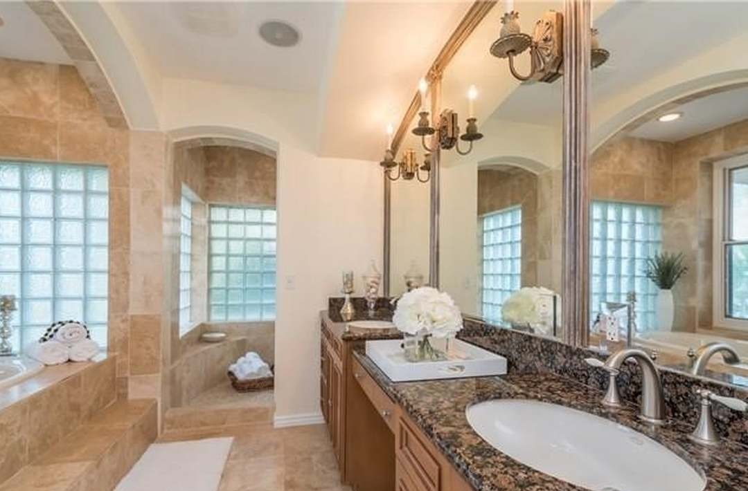 Double VanityWalk In ShowerBuilt In TubLarge MirrorStatement LightingCrown MoldingArched DoorwaysHigh CeilingsFloor To Ceiling WindowsRecessed LightingCustom Millwork