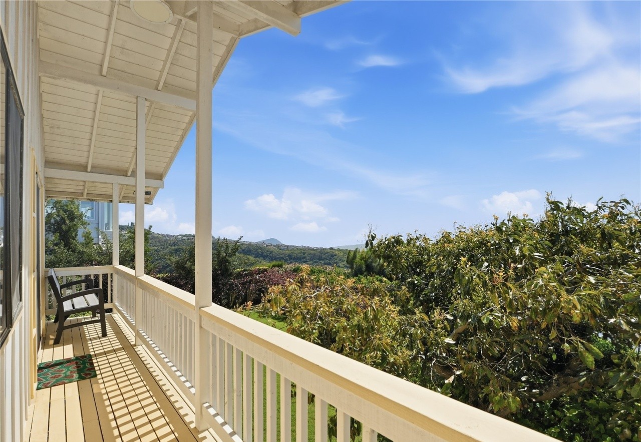 A sophisticated covered patio overlooking rolling green valleys and mature landscaping, featuring clean-lined white pergola beams, composite decking, and lounge seating that frames breathtaking rural views. The design balances minimalist architectural elements with warm organic surroundings, creating a serene retreat that seamlessly integrates indoor comfort with outdoor living.