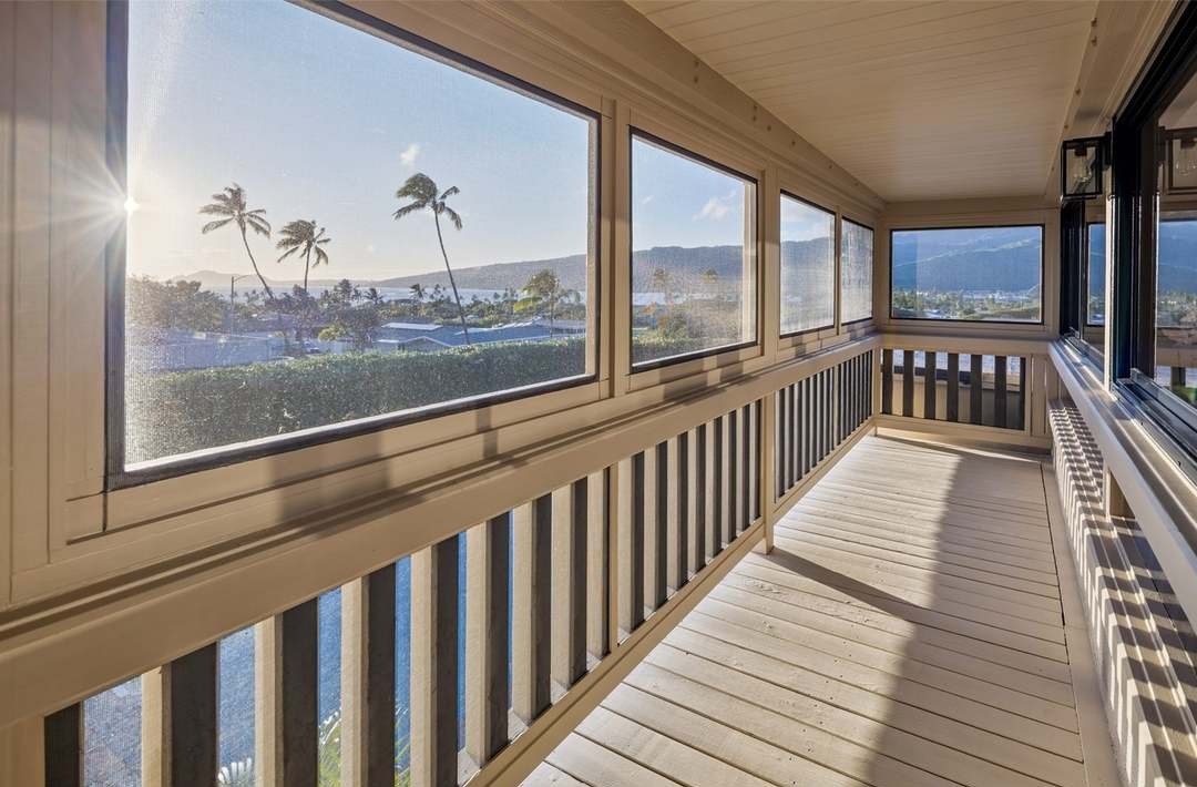A sophisticated covered lanai with expansive floor-to-ceiling windows framing stunning ocean and mountain views, featuring warm composite decking and warm wood plank ceilings that create an inviting indoor-outdoor living space. The design exemplifies modern coastal luxury with its clean lines, abundant natural light, and seamless connection to the tropical landscape beyond.