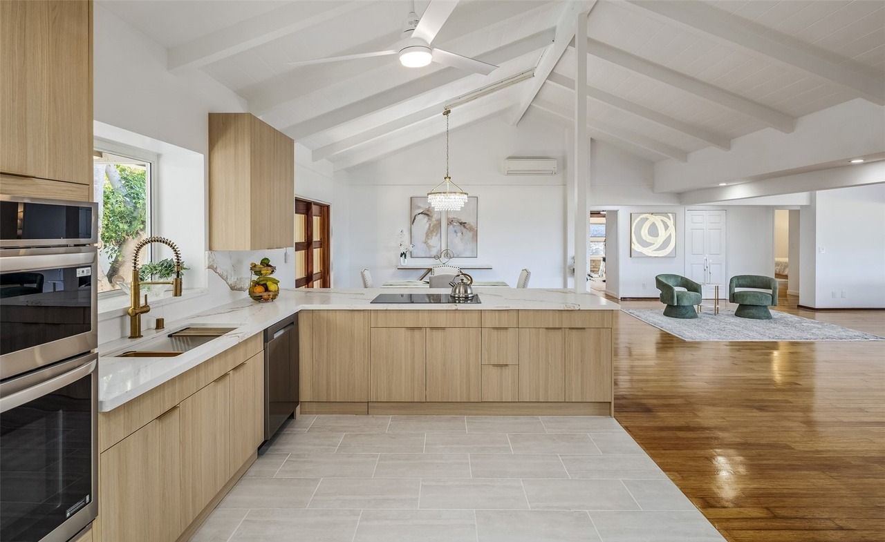 Countertop: QuartziteCabinets: Flat PanelCabinet Color: Light WoodFlooring: Hardwood, TileCeiling: VaultedTile: Large Format