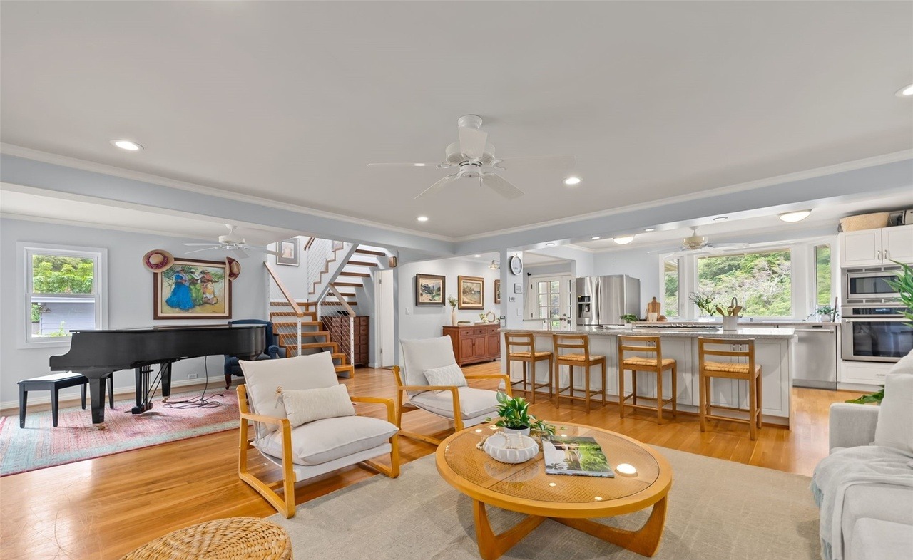 A stunning open-concept living space that seamlessly integrates a grand piano, sophisticated seating, and full kitchen with abundant natural light from oversized windows. The design balances traditional architectural details—crown molding, tray ceiling, and a striking wooden staircase—with contemporary furnishings and a warm, organic material palette of natural oak, cream linens, and hardwood floors.
