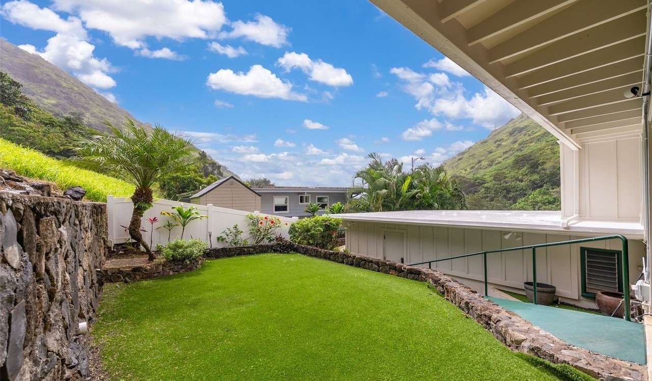 A stunning modern patio carved into a lush mountain valley, featuring a pristine manicured lawn bordered by natural stone retaining walls and native tropical plantings. The covered white overhang and turquoise pool deck create a sophisticated outdoor living sanctuary with breathtaking panoramic views of verdant hillsides and perfect natural light.