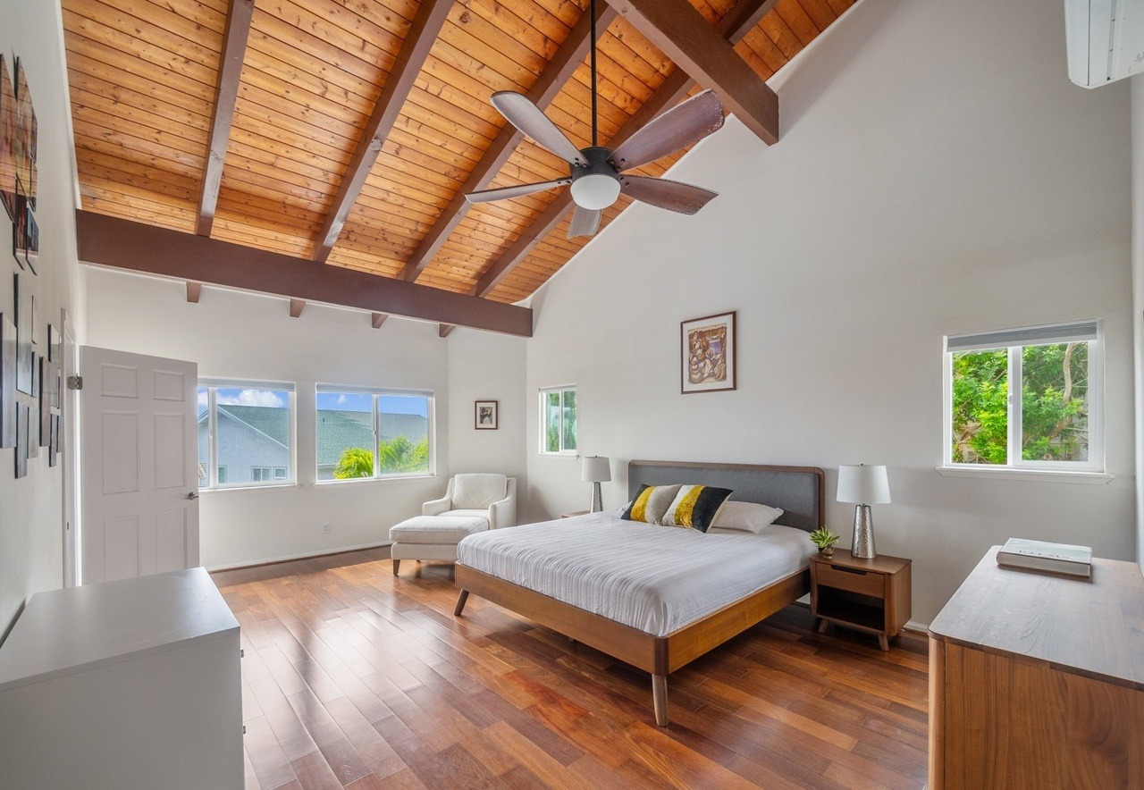 A light-filled primary bedroom featuring a soaring wood-plank cathedral ceiling with exposed timber beams and a modern ceiling fan, combining mid-century modern furnishings with organic, warm materials. The room balances contemporary comfort with classic mid-century design through a walnut platform bed, paired with abundant natural light from large windows and understated, elegant décor.
