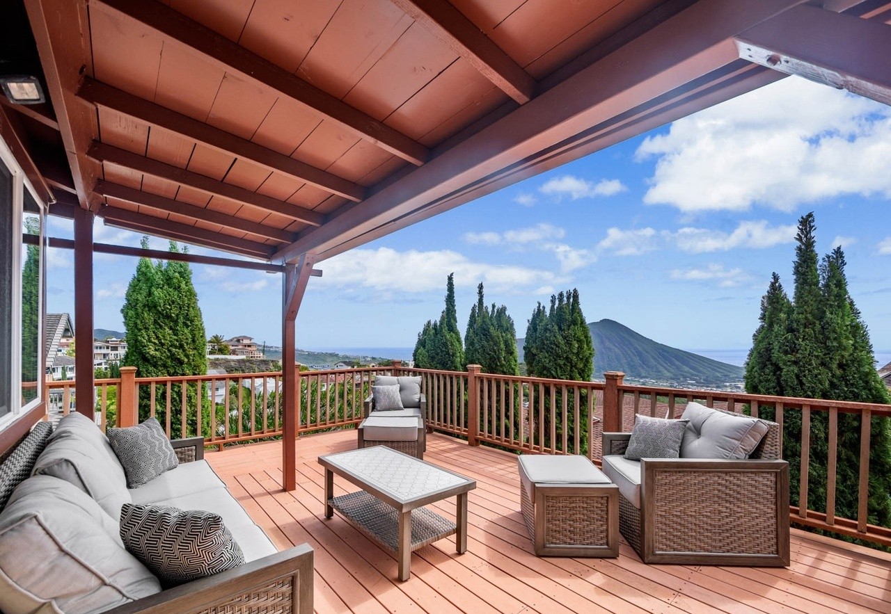 An expansive covered patio with striking terracotta exposed beams and a composite deck, offering panoramic views of distant mountains and cypress trees. The space features high-end wicker seating with neutral cushions and is bathed in abundant natural light, creating an elegant indoor-outdoor living environment with refined mountain aesthetic.