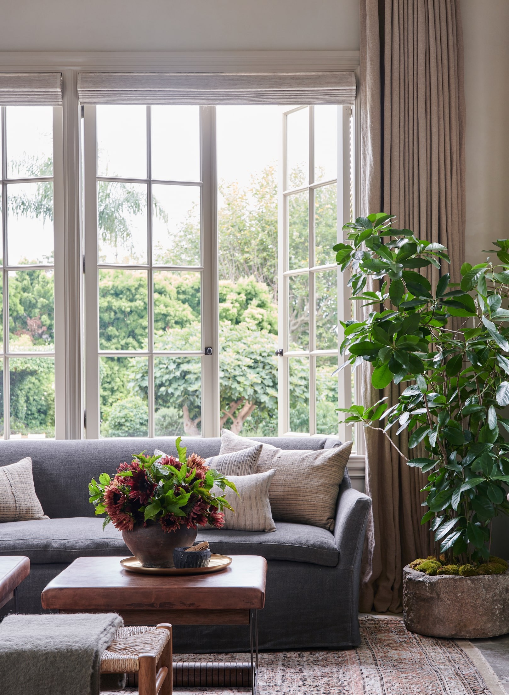A sophisticated transitional living room featuring floor-to-ceiling French windows with Roman shades and neutral drapery, anchored by a gray sofa with textured pillows and a rustic wood coffee table. The space balances classic architectural details with organic modern furnishings, abundant natural light, and thoughtful botanical styling including a statement fiddle leaf fig tree in a stone planter.
