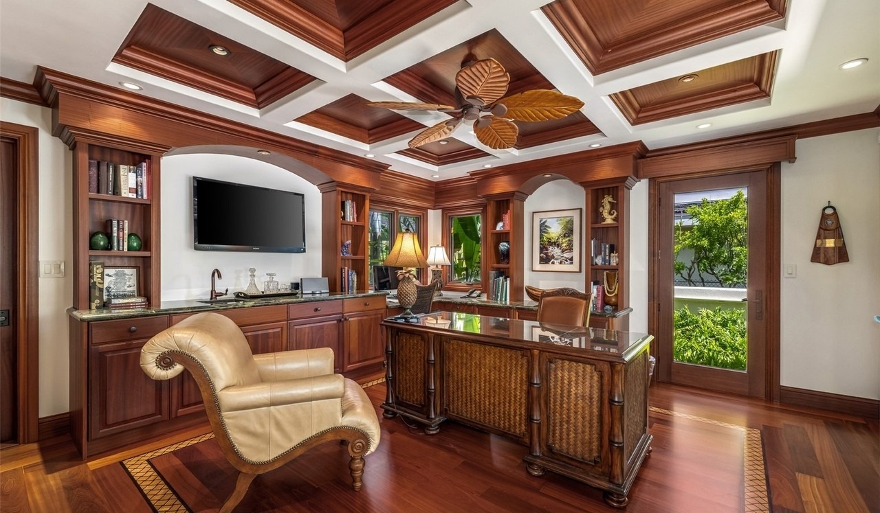 A stately executive home office featuring richly detailed mahogany cabinetry, a bespoke coffered ceiling with decorative fan, and granite countertops throughout. The sophisticated layout seamlessly integrates a wet bar, extensive built-in shelving, and a luxurious cream leather wingback chair, creating an opulent retreat that blends classic architectural elements with high-end finishes and abundant natural light.